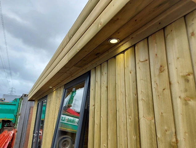 Bardage intérieur et extérieur en bois massif traité.