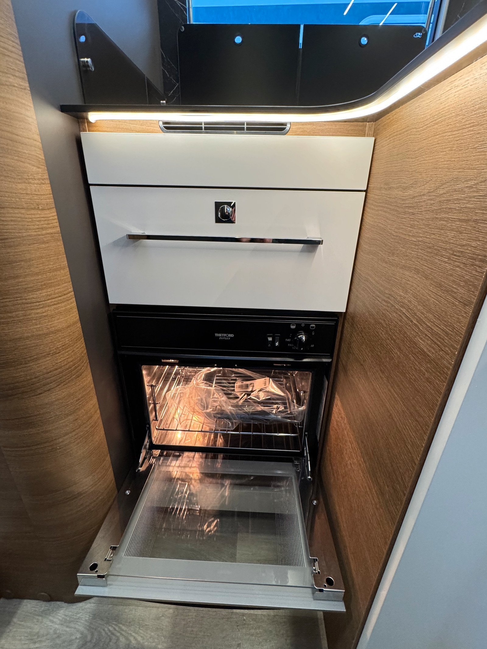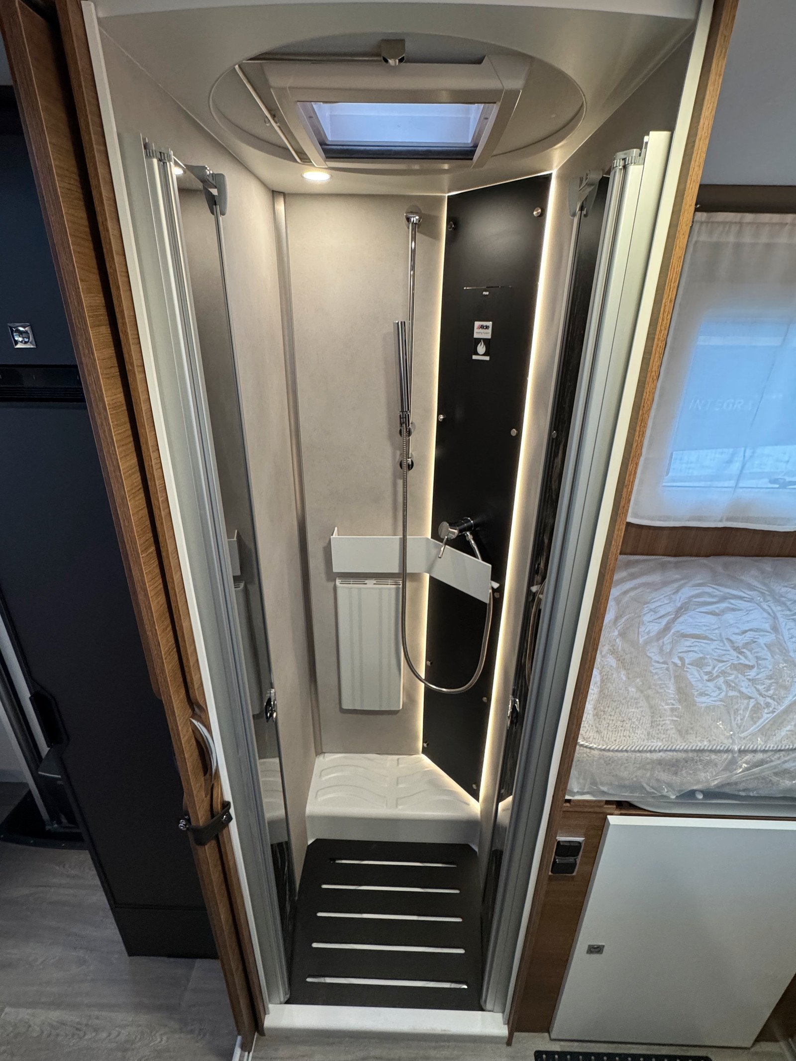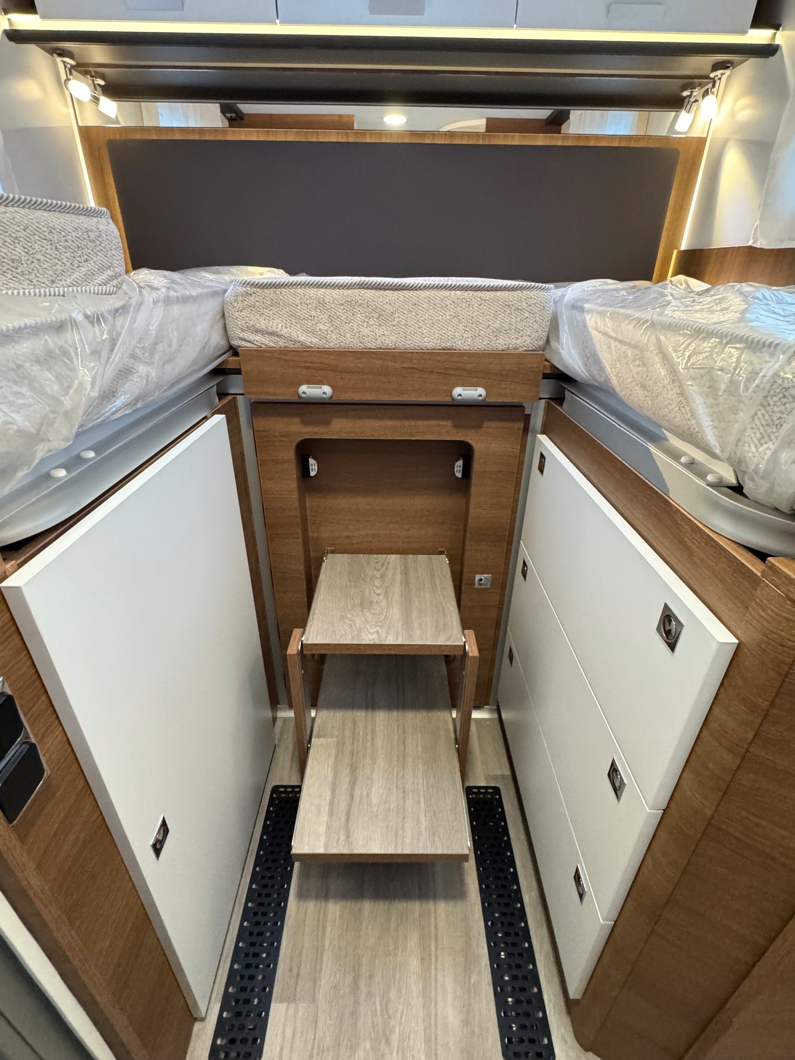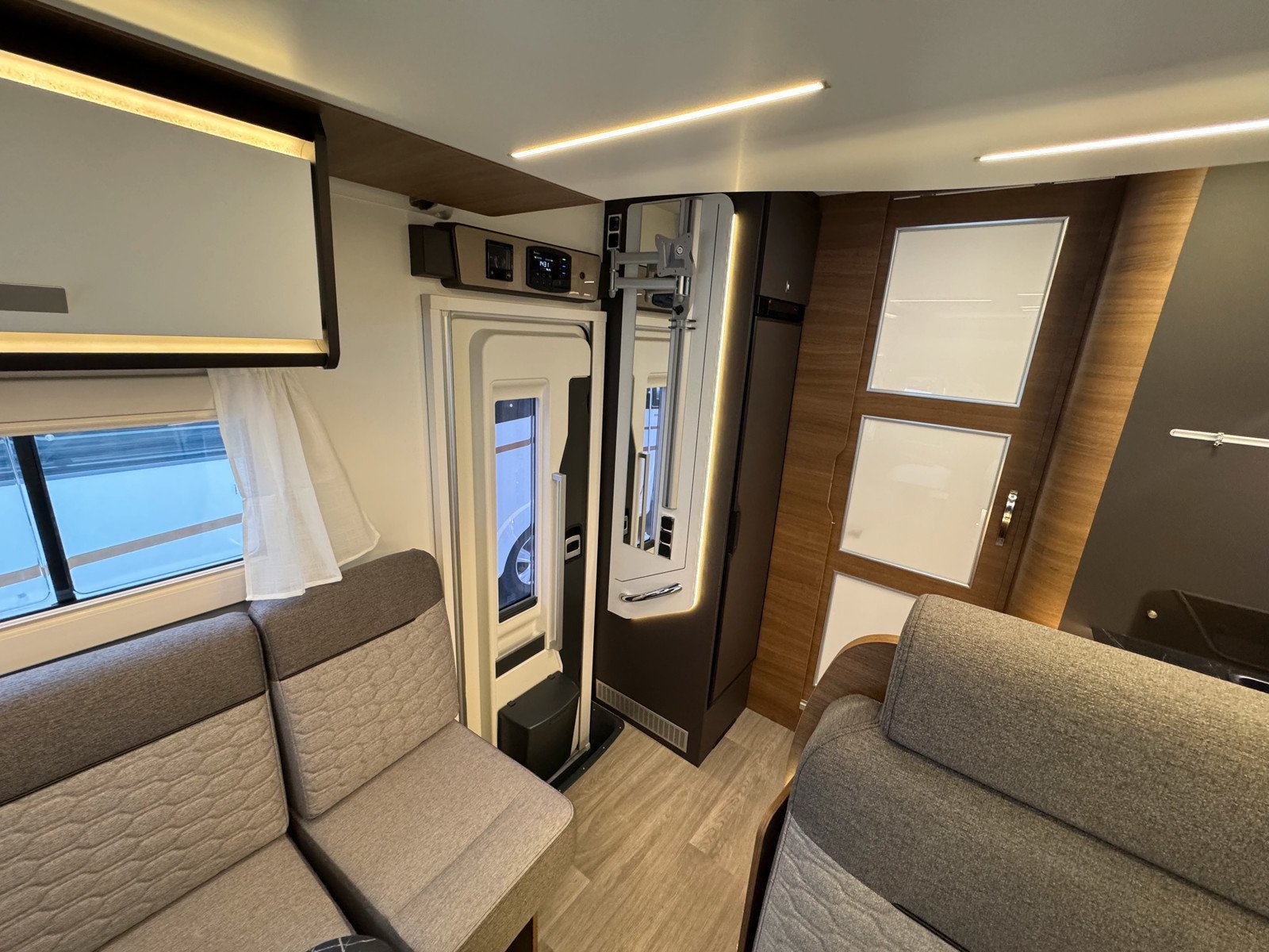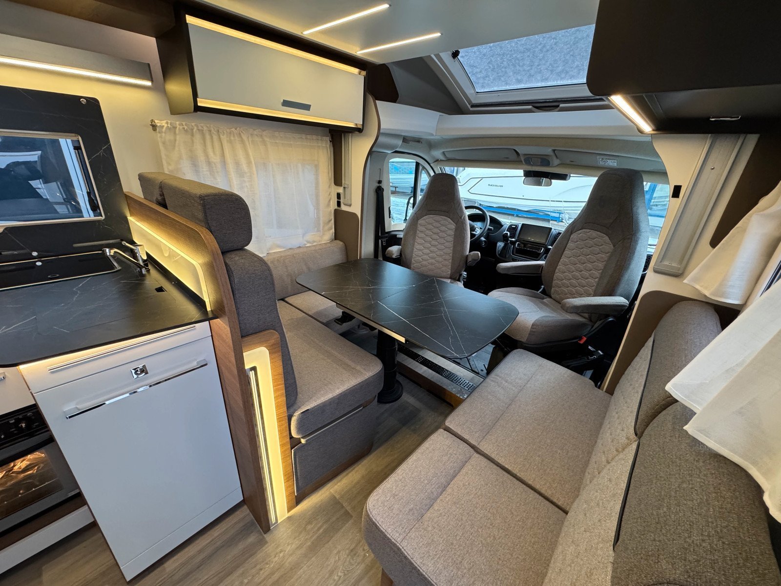 Les sièges pilotes à l’avant sont réversibles. Il y a également un lit mezzanine électrique qui peut être abaissé si vous avez des invités qui passent la nuit.