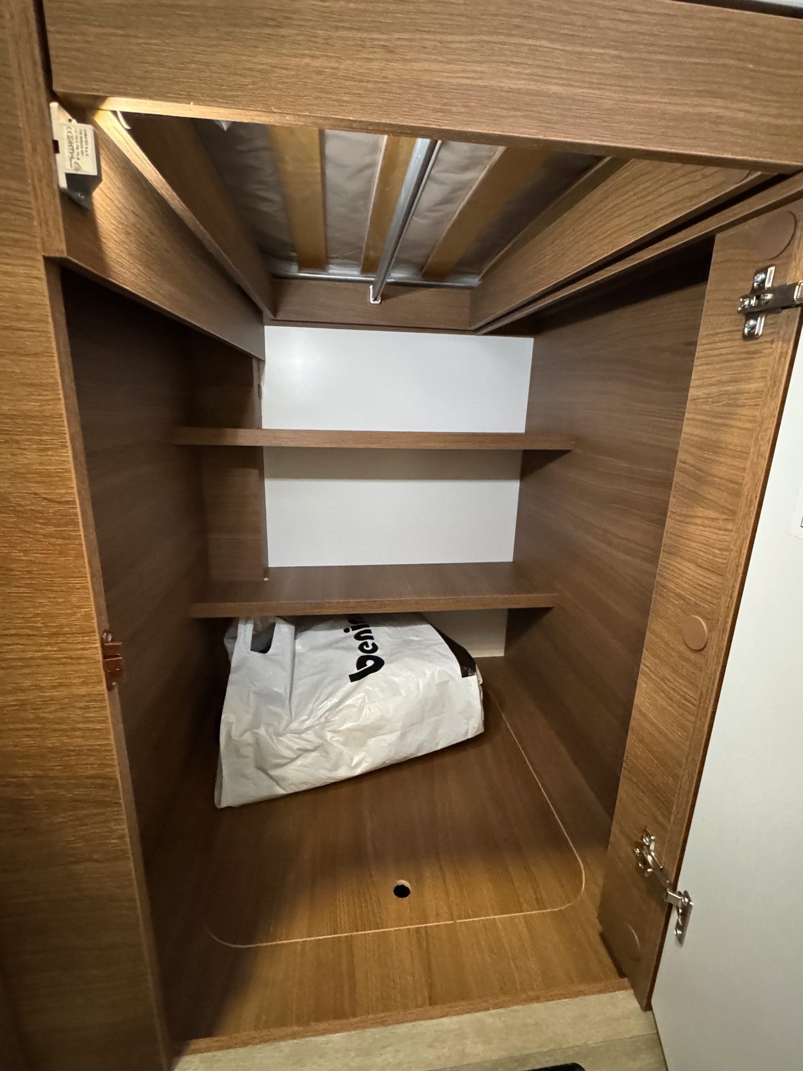 Ce camping-car dispose de la solution populaire de deux lits simples à l’arrière, qui peuvent facilement être convertis en un grand lit double en tirant le panneau du milieu. Il y a également des escaliers jusqu’au lit pour un accès facile + la possibilité d’accéder au garage depuis l’intérieur de la voiture. Beaucoup d’espace de rangement pour le matériel et les vêtements sous et au dessus du lit.