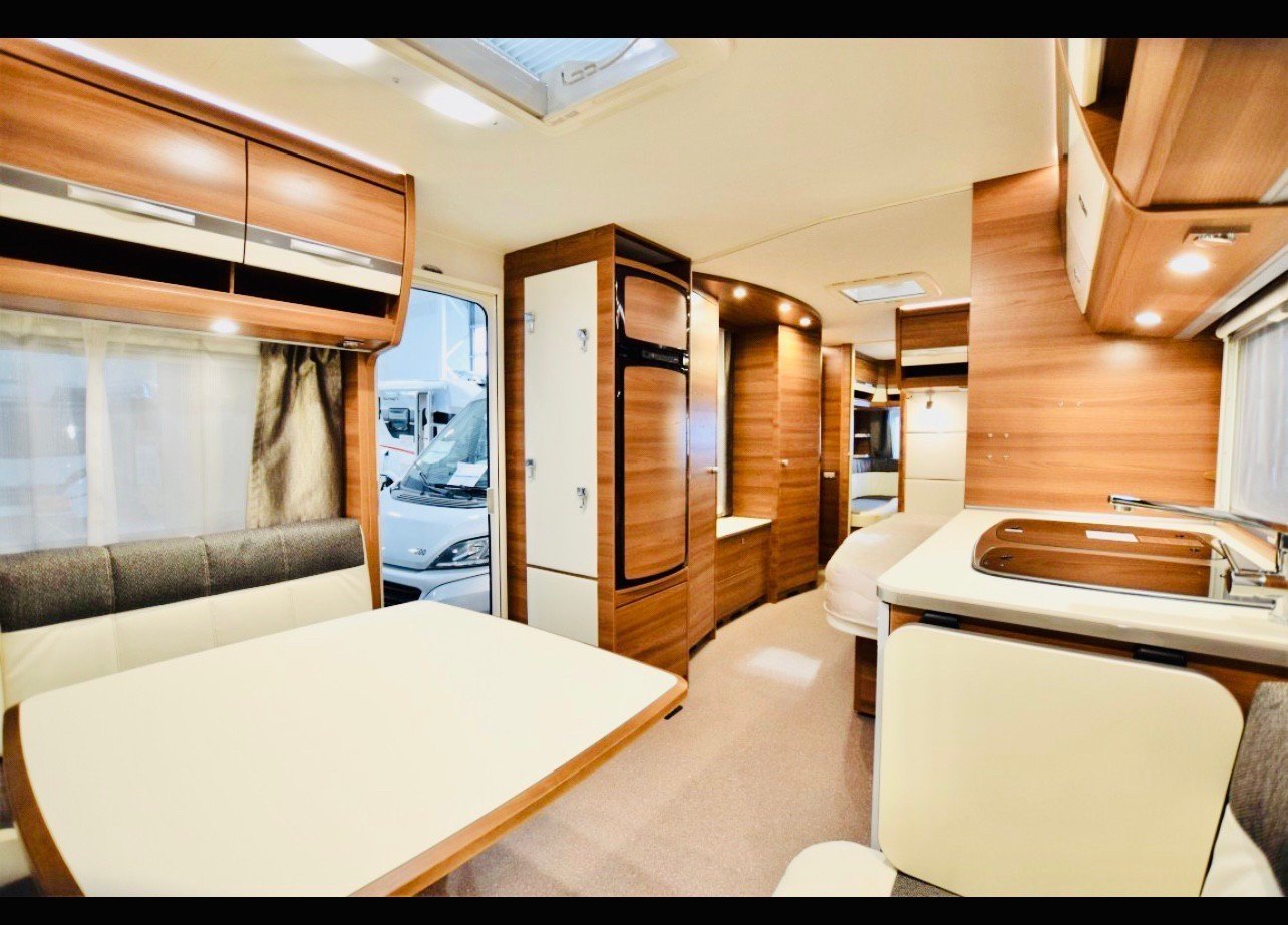 Tôles latérales lisses et rebords aluminium, moquette de lit, moquette de sol, tableau de commande 12V, extincteur, rallonge de plan de cuisine, éclairage indirect, porte d’entrée avec fenêtre et porte moustiquaire, Softclose sur trappes de placards de pavillon