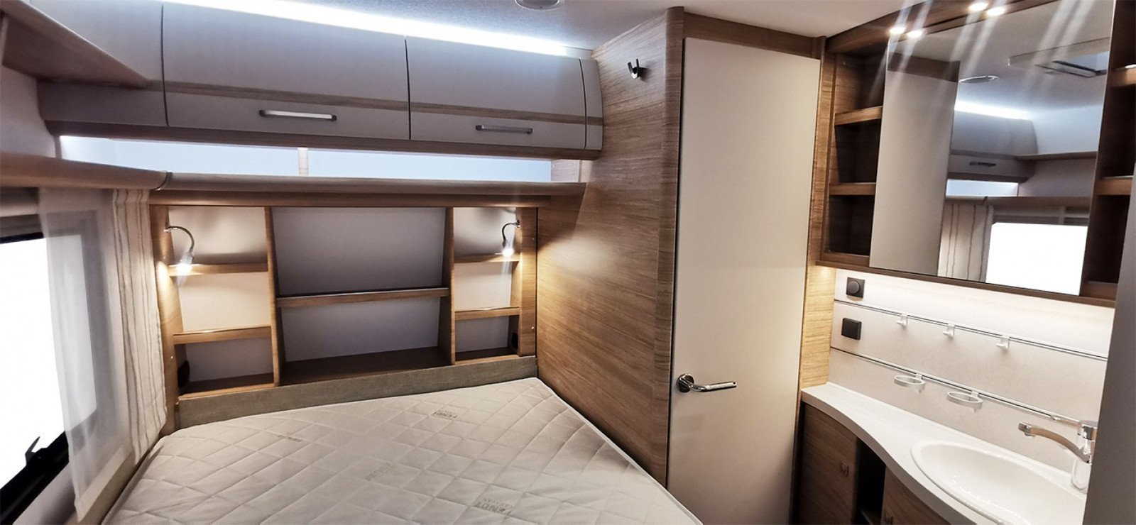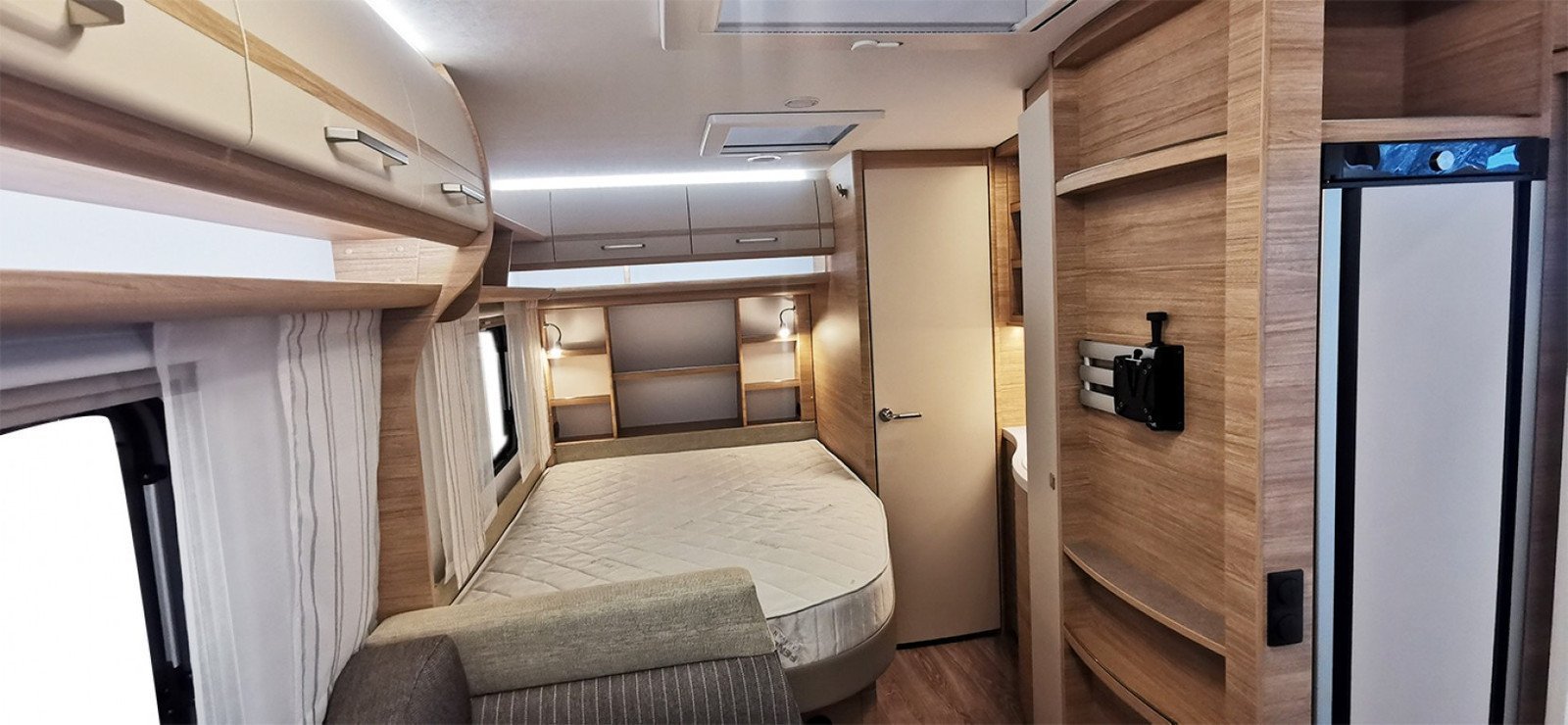 Armoires supérieures spacieuses, meublées de manière pratique avec 1 armoire pour les ustensiles de cuisine hauts et 1 armoire pour les verres et plus encore. Les tiroirs de la cuisine sont grands et profonds et peuvent facilement accueillir la plupart de ce dont vous avez besoin. 3 plaques chauffantes et un bon évier. Beaucoup de prix dans la cuisine et une indication de niveau séparément pour le réservoir d’eau. Accrochez-vous au mur du fond. Le réfrigérateur est génial et offre un bel espace avec un espace congélateur. Le réfrigérateur fonctionne sur 230 V, gaz ou 12 V et peut être ouvert des autres côtés.