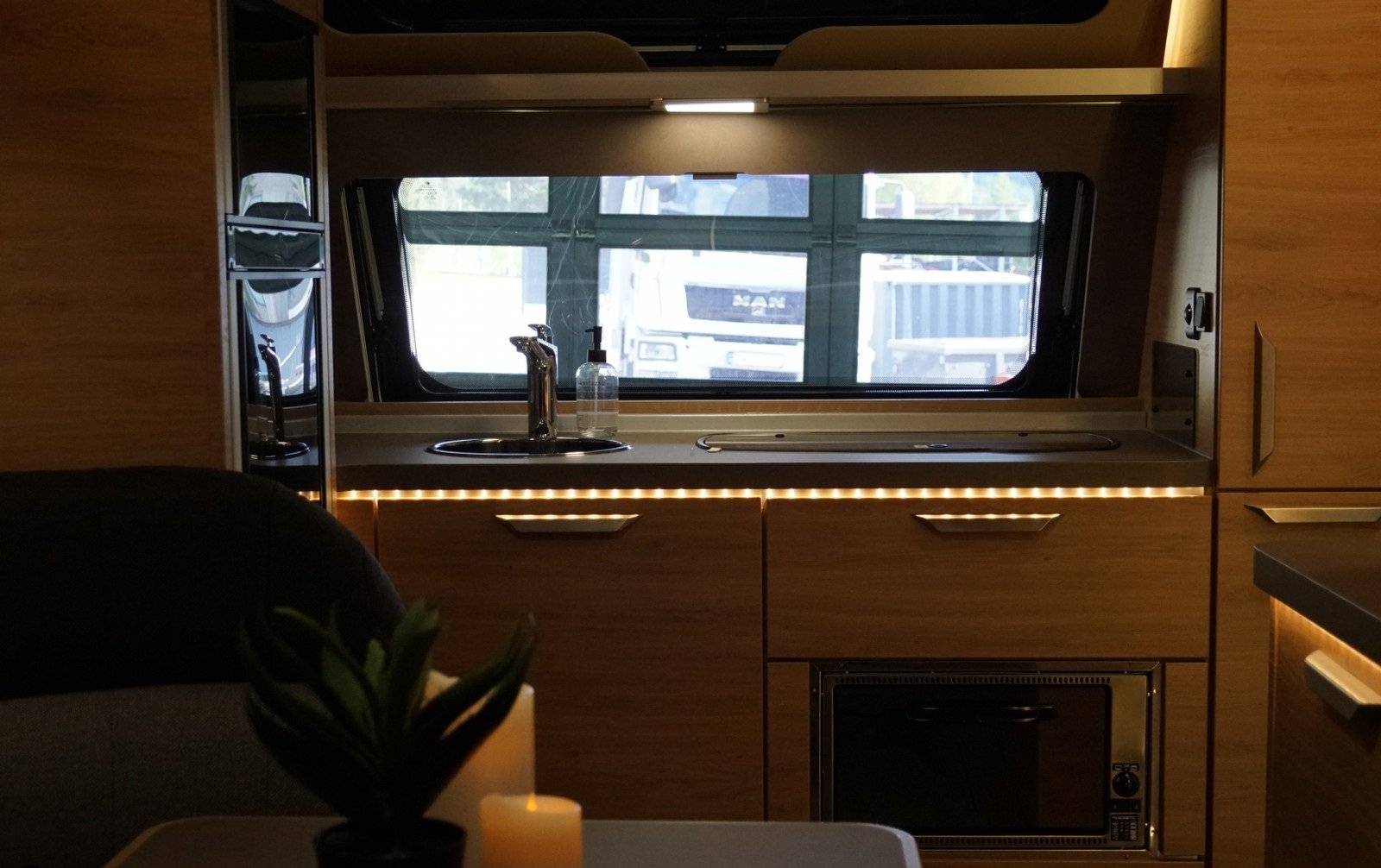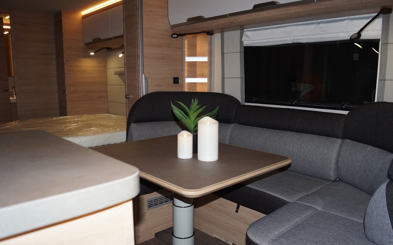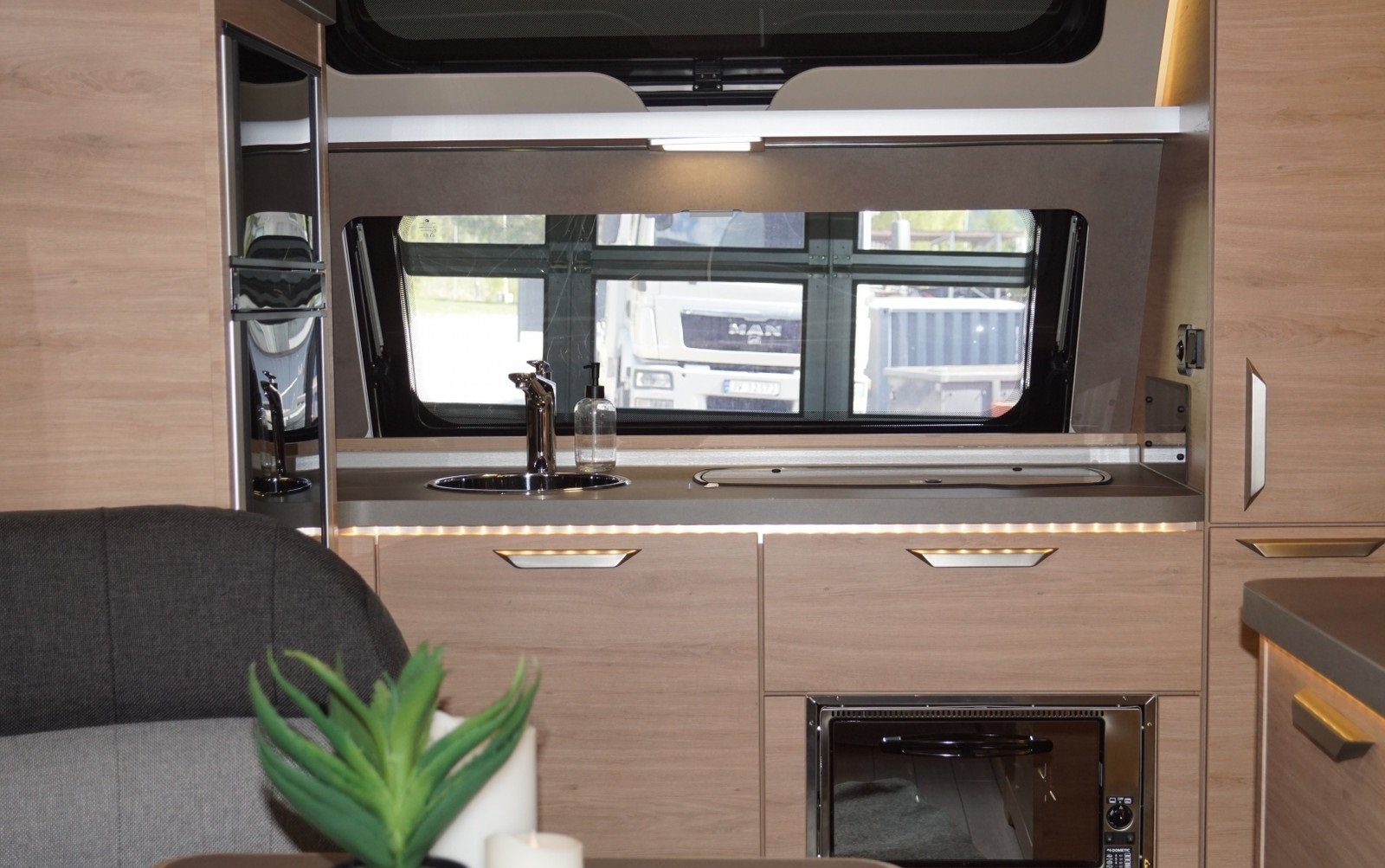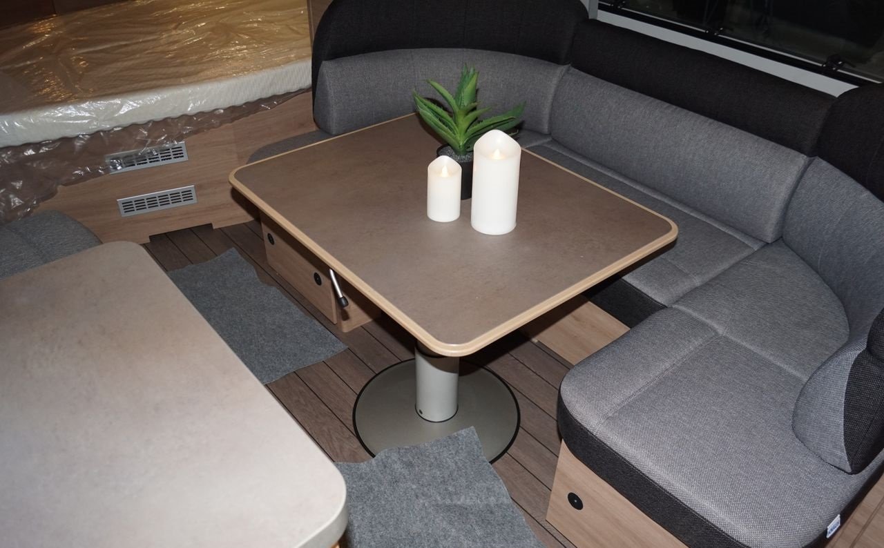Coin salon spacieux au milieu de la voiture avec une cuisine pratique dotée de bons tiroirs et de nombreux placards.
