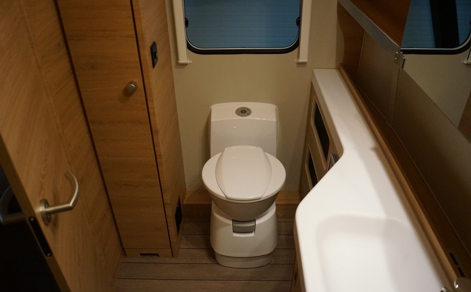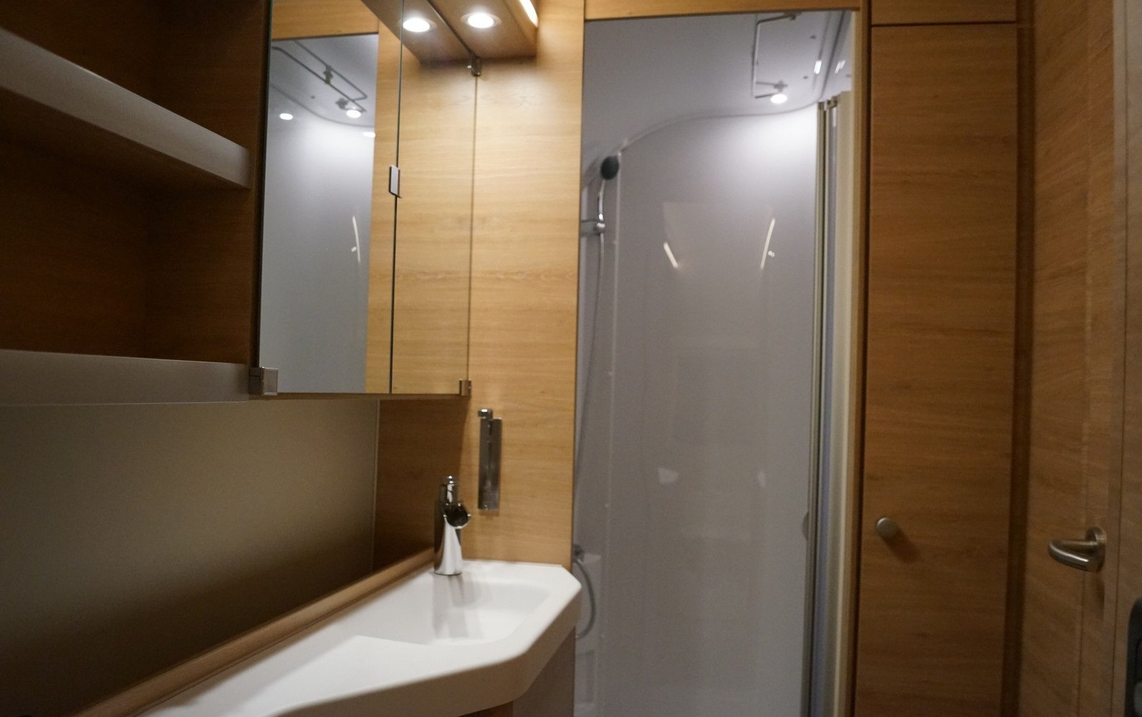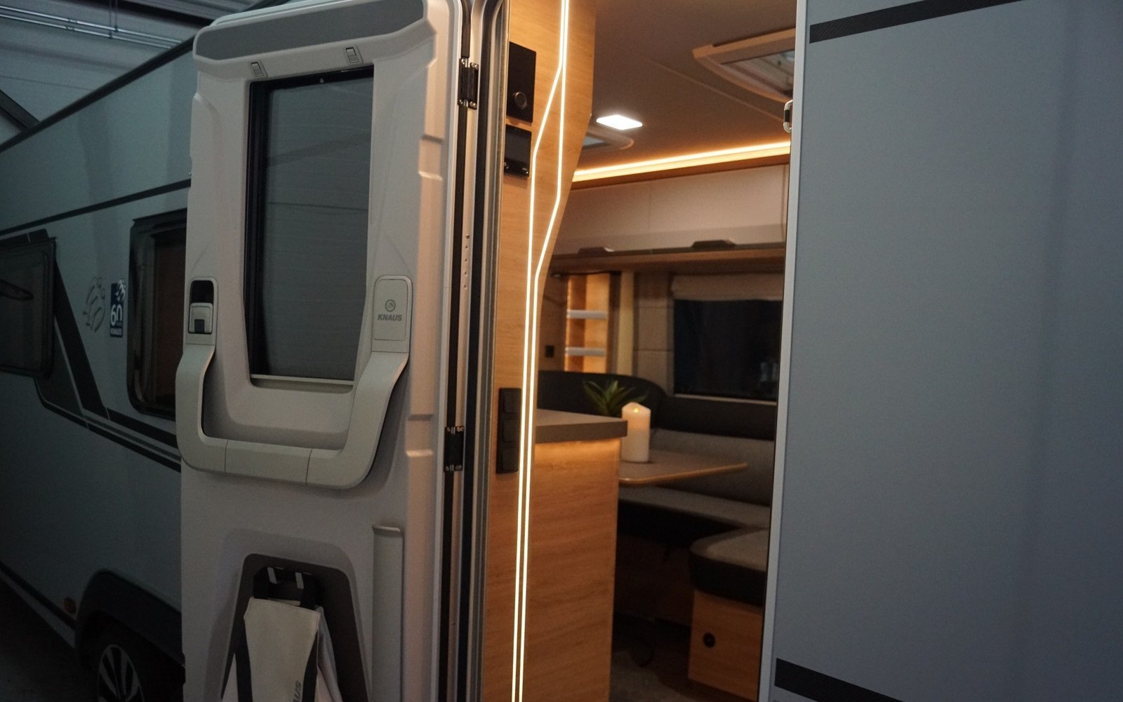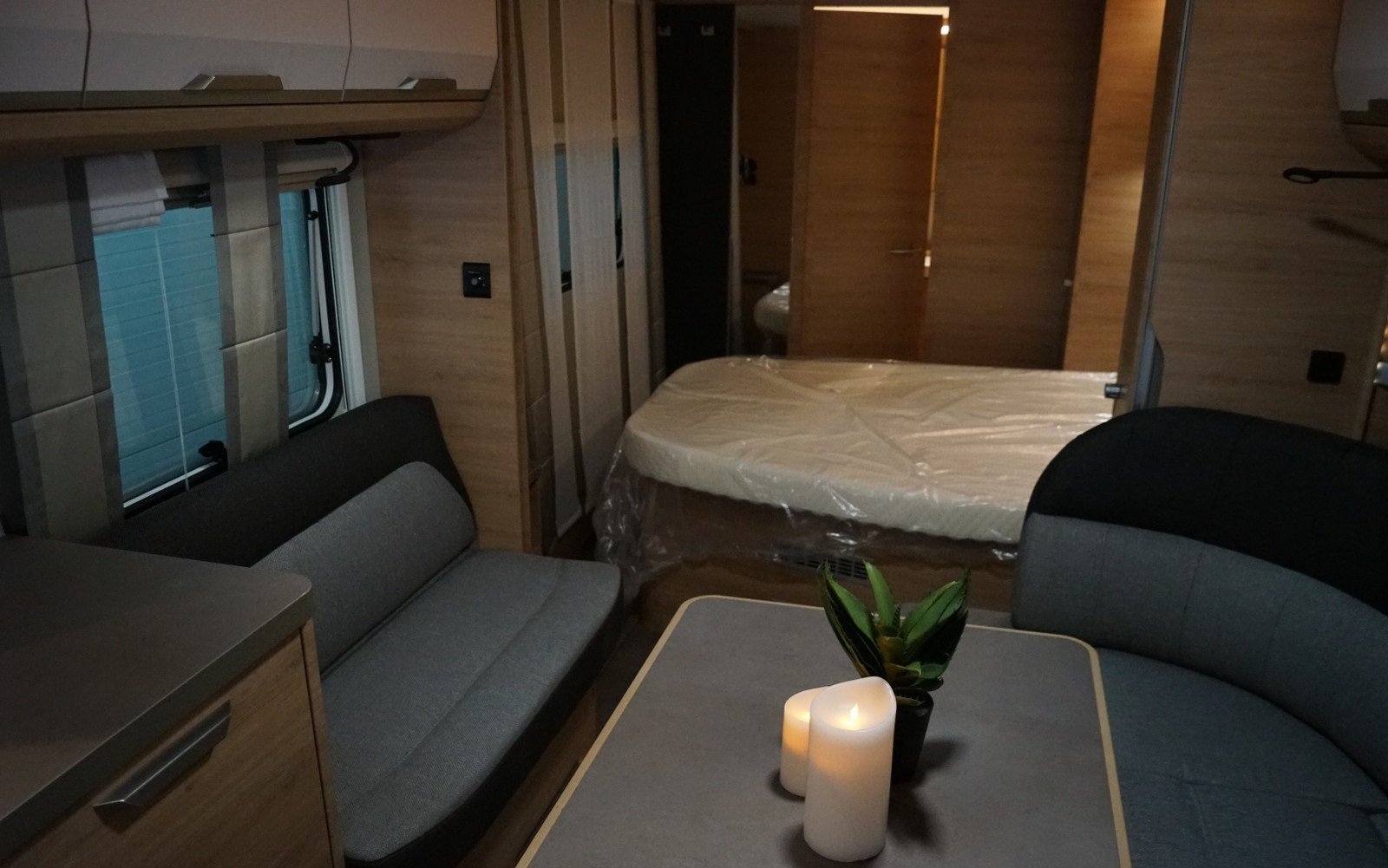Coin salon spacieux au milieu de la voiture avec une cuisine pratique dotée de bons tiroirs et de nombreux placards.