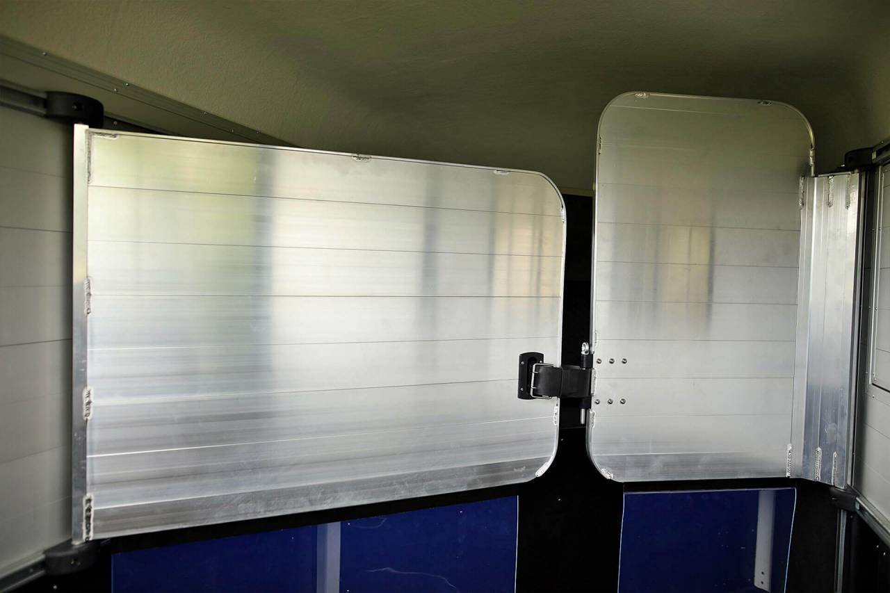 – Séparation demi bat flanc aluminium avec séparation de tête, fermeture par sangle cuir,