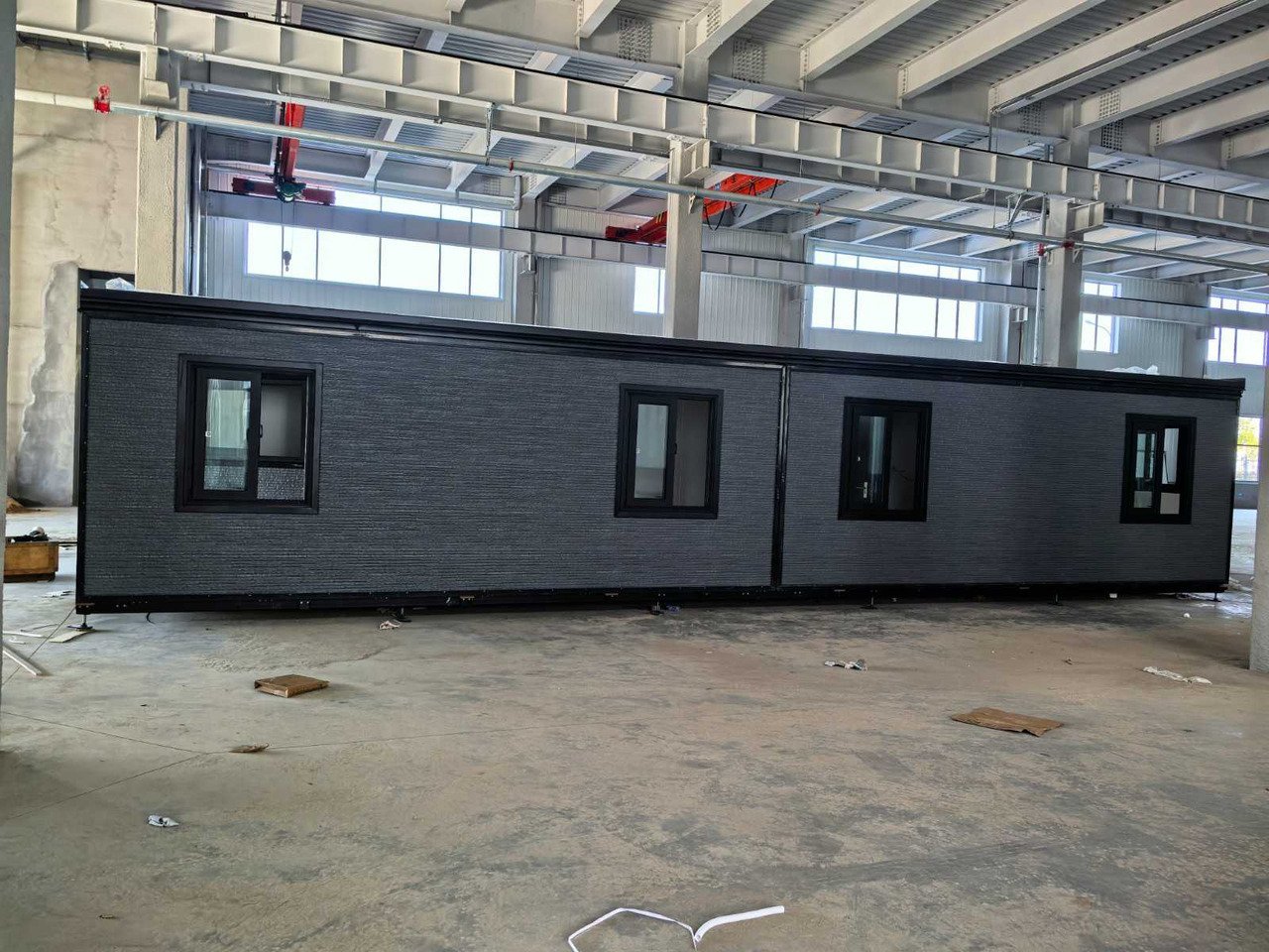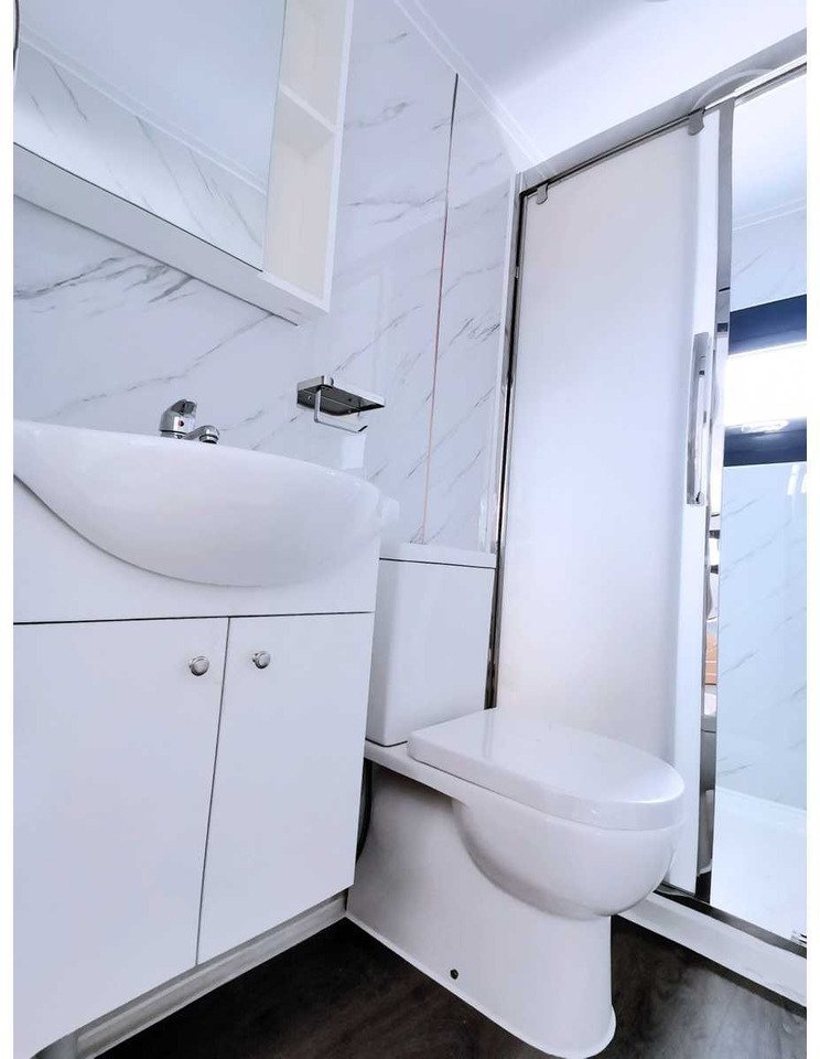 Equipé de murs et d’un toit isolés ; 3 pièces fermées (chambres) ; coin cuisine avec placards au-dessus ; armoire à compteur ; salle de bain avec toilettes et douche à effet pluie ; lavabo avec armoire de toilette et robinetterie de toilette ; sol en vinyle ; système de ventilation ; points de connexion pour l’éclairage de plafond (y compris les plafonniers) ; cadres en plastique avec double vitrage ; canal de drainage ; plateau; l’eau, l’électricité et le drainage peuvent être facilement connectés est préparé ; verrouillable avec clé et cylindre à bouton ; y compris les plafonniers, les prises et les interrupteurs ; dimensions plié 11900x2150x2550 mm (dimensions de transport) ; Les dernières photos sont de l’intérieur mais avec des portes noires, une douche noire, une cuisine noire et un sol à chevrons