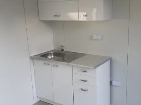 Kitchenette équipée de 5 meubles en finition blanc brillant.