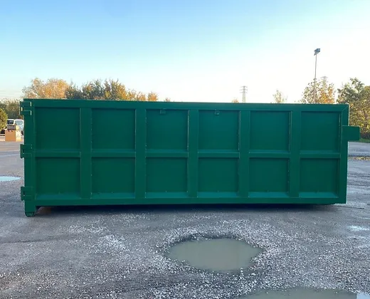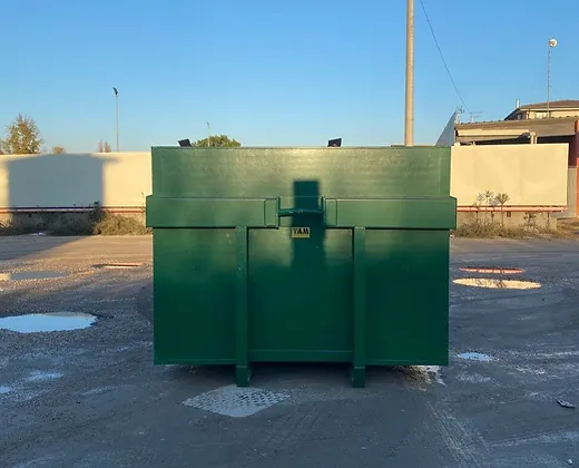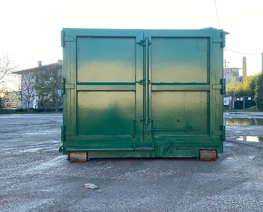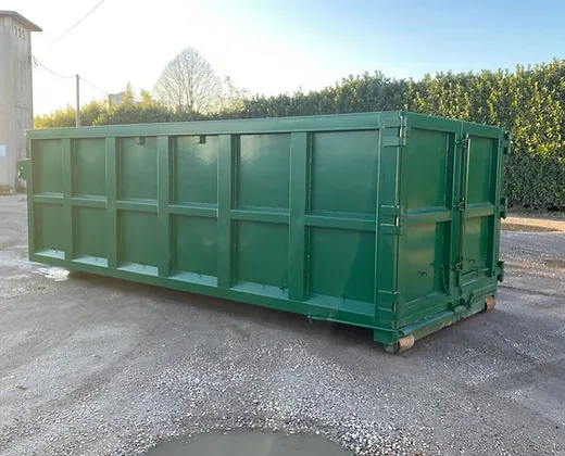 NOUVEAU CONTENEUR ROLL-OFF OUVERT POUR DÉCHETS ENCOMBRANTS À OUVERTURE ARRIÈRE AVEC DEUX PORTES PLIANTES À 3 CHARNIÈRES, LE FOND SUPPORTE LES POUTRES DE 200 MM