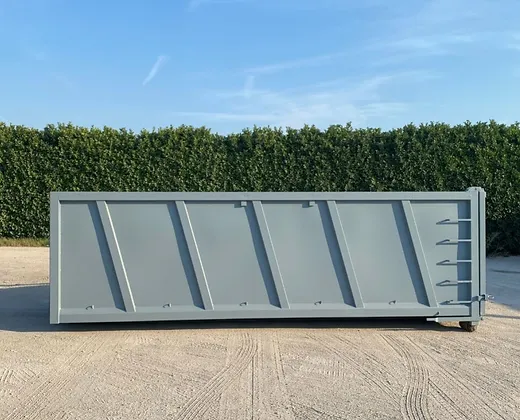 NOUVEAU ROLL-OFF ONTAINER OUVERT AVEC OUVERTURE ARRIÈRE AVEC PORTE SIMPLE ABATTANT AVEC FOND SUPPORTANT LES POUTRES DE 0,20 MT RENFORCÉES DANS LA PARTIE CENTRALE (REVÊTUES SUR LE CÔTÉ EXTÉRIEUR) ÉTANCHE