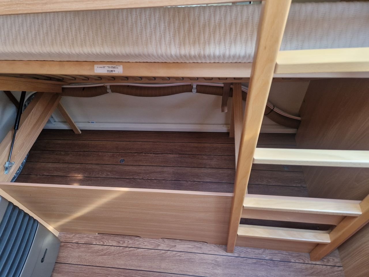 La caravane dispose de 2 lits superposés et d’un lit double avec un espace de rangement en dessous. En outre, le salon peut être converti en 2 lits supplémentaires.
