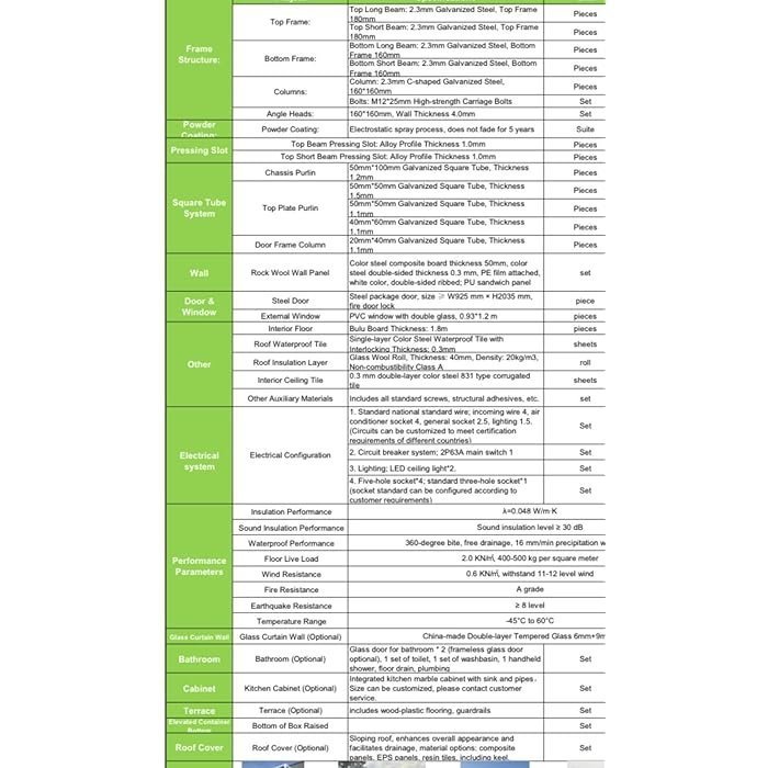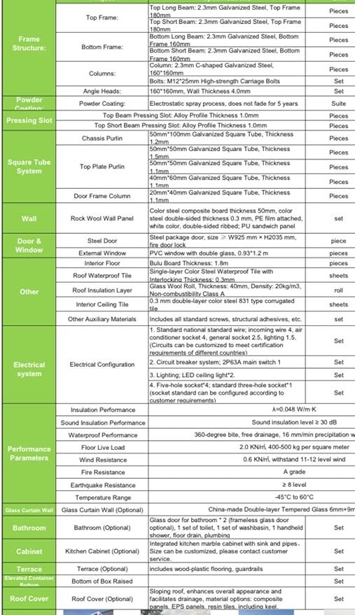 – Vent, tremblement de terre, feu et étanchéité. Résistant aux typhons. Classe de résistance au feu A – Résistance au vent jusqu’au niveau 11 – Résistance aux séismes jusqu’au niveau 9. ** Personnalisable**_La couleur peut être personnalisée. L’extérieur peut également être personnalisé. En gardant vos besoins à l’esprit, nous vous proposons une liste d’options personnalisables : -1 chambre, 1 salon, 1 salle de bain -2 chambres, 1 salon, 1 salle de bain -3 chambres, 1 salon, 1 salle de bain -4 chambres, 1 salle de bain.