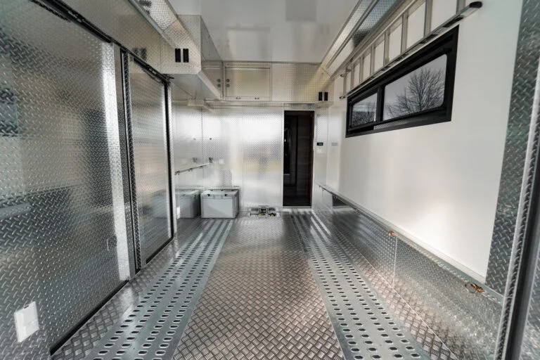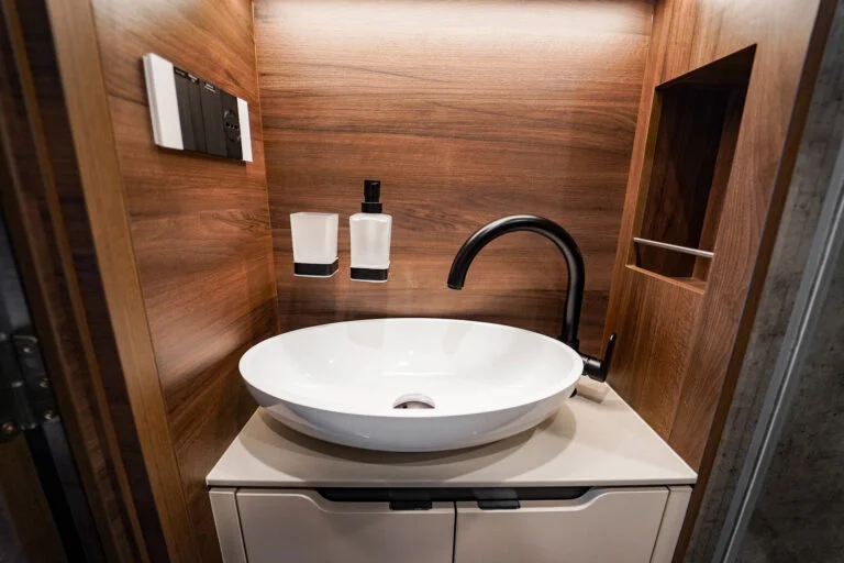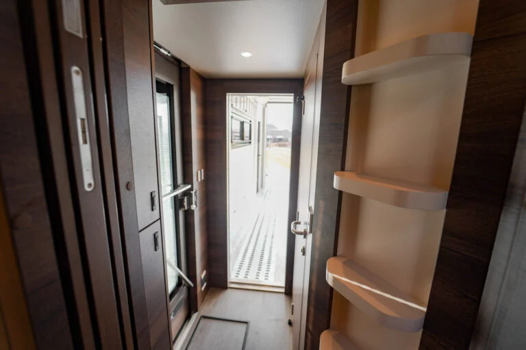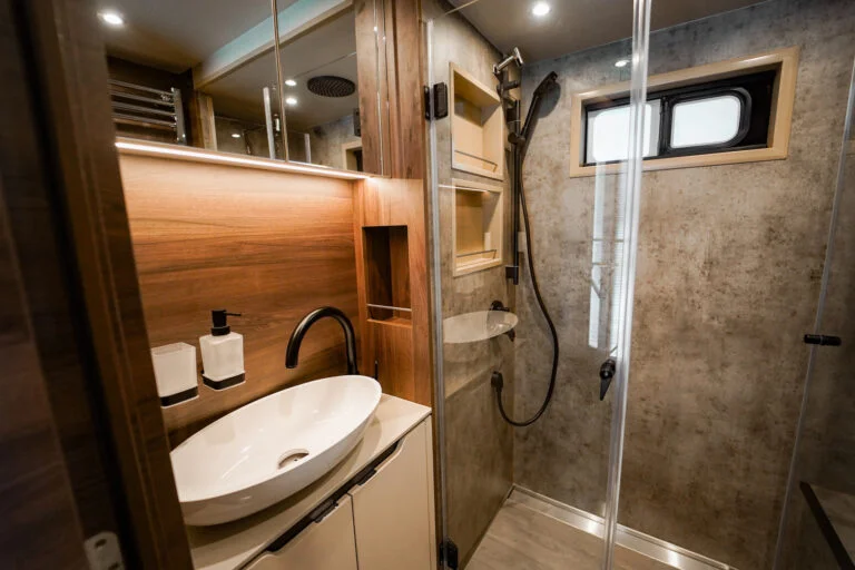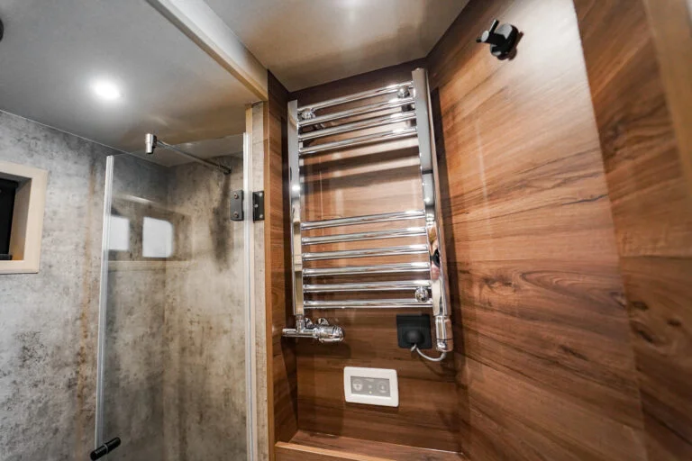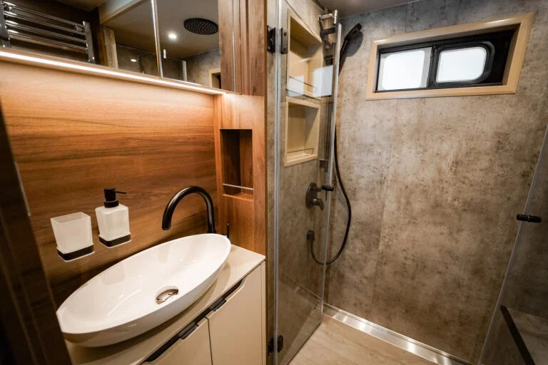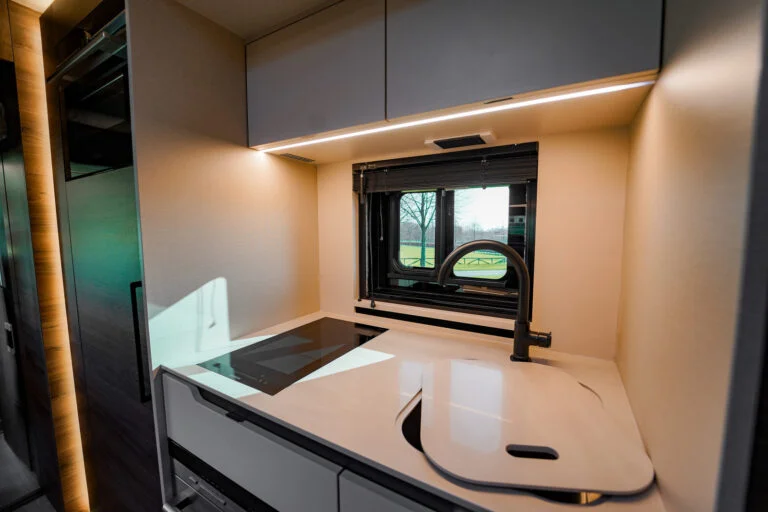 La voiture a un pop-up de 2,2 mètres de chaque côté et un pop-up dans le lit au-dessus de la salle de bain, cela donne une incroyable sensation d’espace. La voiture a un intérieur agréable et exclusif. La section sport automobile est conçue pour ceux qui souhaitent emmener leur voiture avec eux en voyage ou en course, tout en vivant à la maison.