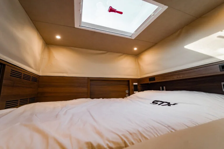 Inscrit pour 8 personnes. Total 6 places de couchage ; lit double au-dessus du poste de conduite, lit double au-dessus de la salle de bain et possibilité d’y poser une table de salon et d’y faire un lit double.