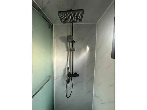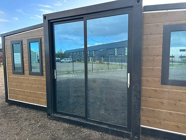 Equipé d’un dépliant ; murs et toiture isolés ; cuisine d’angle avec comptoir, évier, mitigeur, armoires supérieures, armoires de cuisine et tiroirs ; 2 chambres / pièces supplémentaires ; salle de bain avec toilettes, douche à effet pluie, lavabo avec miroir et robinetterie de toilette ; Plancher SPC en aspect bois ; prises de courant (connexion 230 volts) ; huisseries à double vitrage ; l’eau, l’électricité et le drainage peuvent être facilement connectés est préparé ; portes coulissantes ; armoire à compteurs ; interrupteurs d’éclairage ; points de raccordement pour l’éclairage au plafond (y compris les plafonniers) ; y compris les plinthes en aluminium pour le sol ; verrouillable avec clé ; dimensions déplié 5900x6400x2530 mm ; dimensions plié 5900x2220x2540 mm (dimensions de transport) ; inutilisé