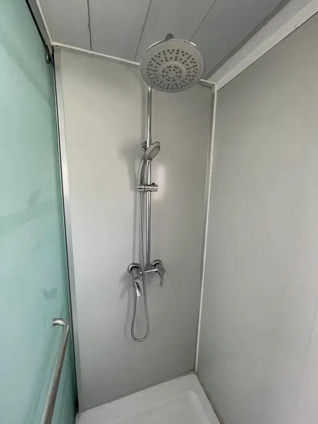 La petite maison est complétée par une salle de bains bien aménagée, comprenant une douche, des toilettes et un meuble-lavabo. Compacte mais élégante, cette salle de bains optimise l’espace sans compromettre le confort.