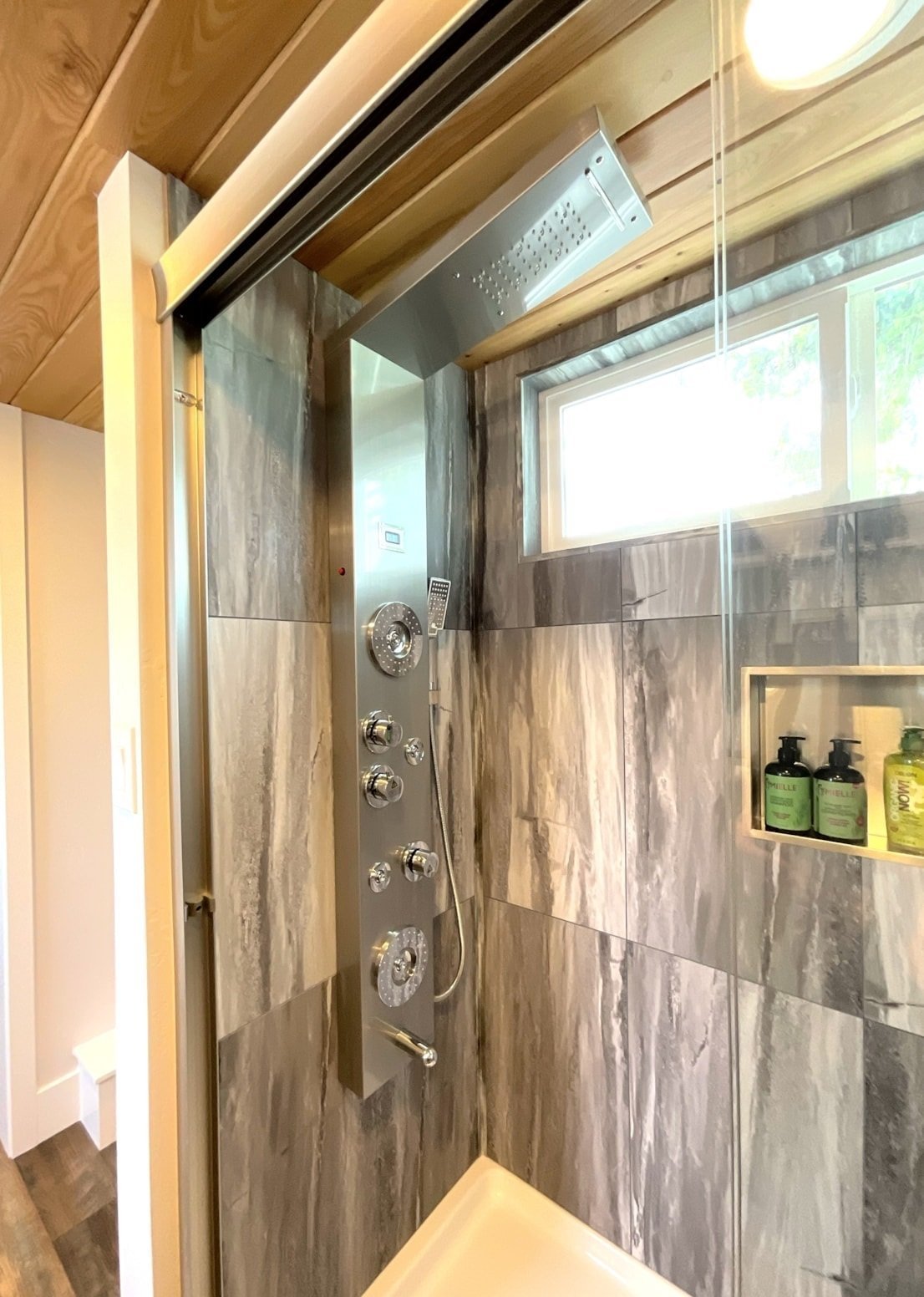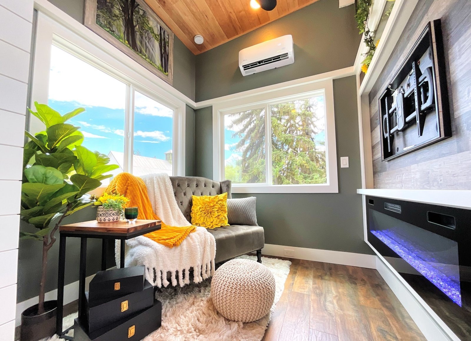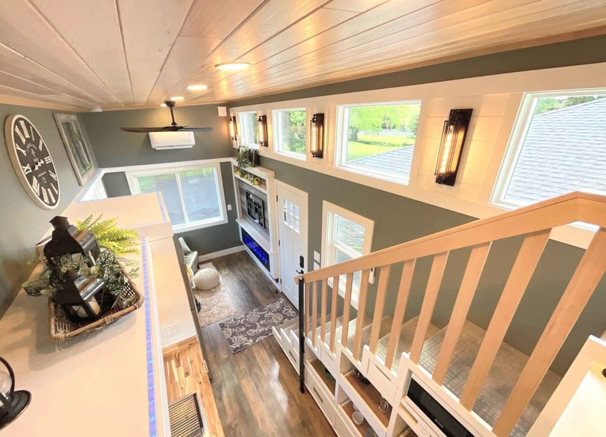 -Système mini-split 110 V avec contrôle climatique, cuisinière au propane, chauffe-eau et raccordement pour sécheuse.