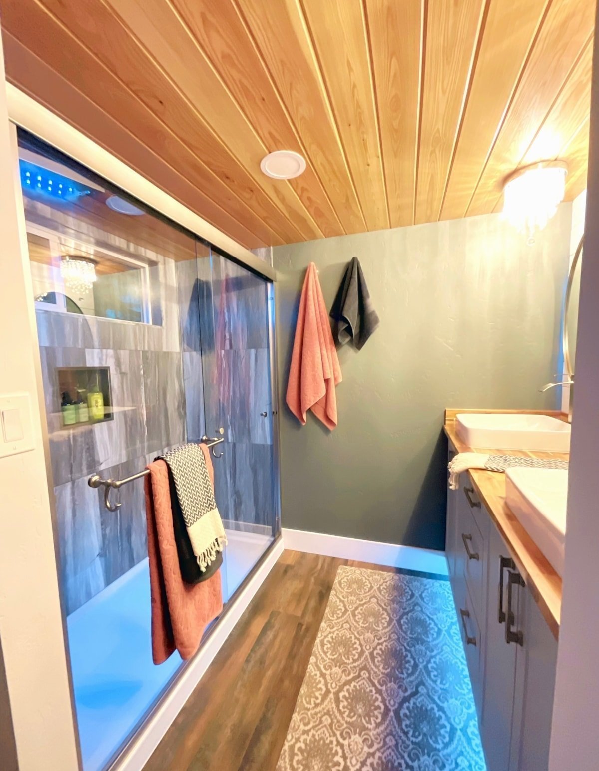 -Extérieur : Deux prises extérieures, projecteurs, prise d’air frais, ventilateur de bain Bluetooth